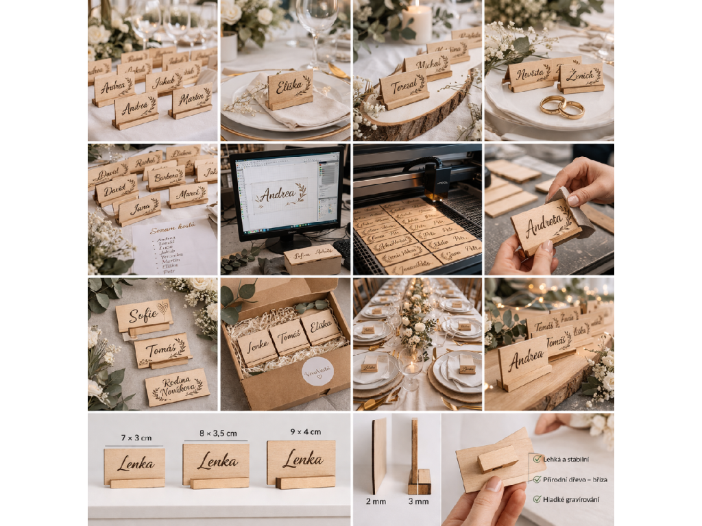 Základní varianta je vyrobena z přírodního dřeva břízy. Standardní rozměr gravírované destičky je 7 × 3 cm, ale na přání lze rozměr upravit podle stylu svatby nebo délky jmen. Díky tomu je možné připravit jednoduché minimalistické jmenovky i výraznější provedení, které bude součástí celkové dekorace slavnostní tabule.