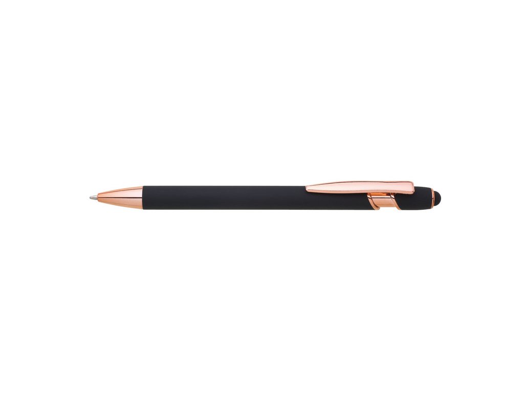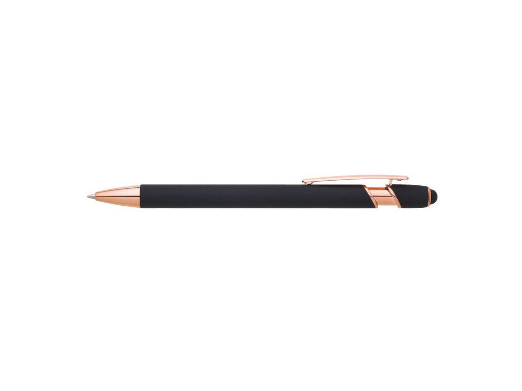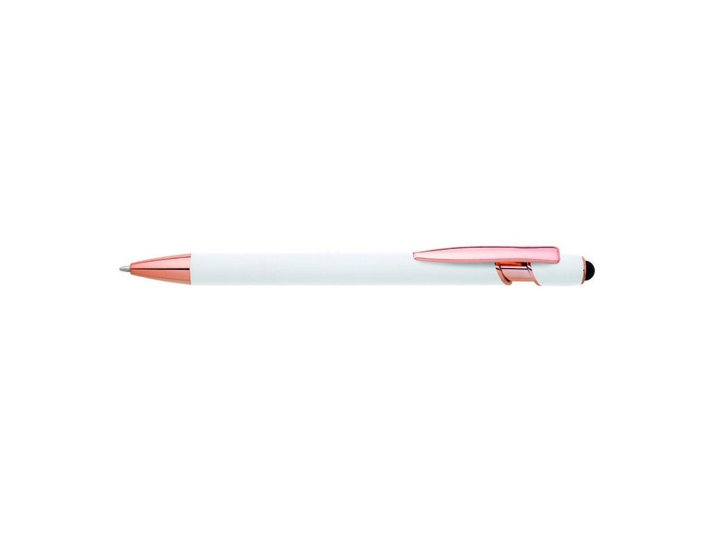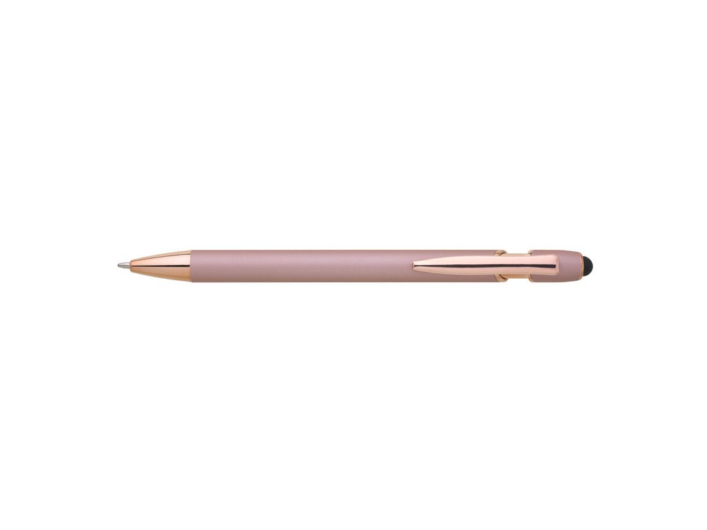 Kovová propiska se soft povrchem, touch koncovkou a doplňky v růžovo-zlaté barvě. Laserované logo je lesklé, růžovo-zlaté. Náplň modře píšící. Výsledný efekt laserového značení je lesklý, v barvě doplňků.