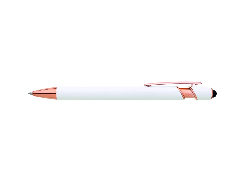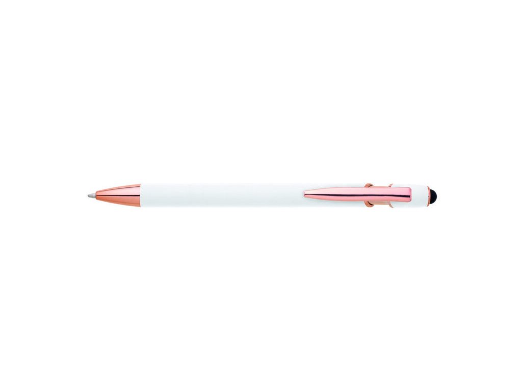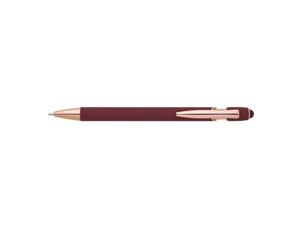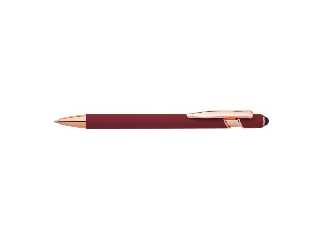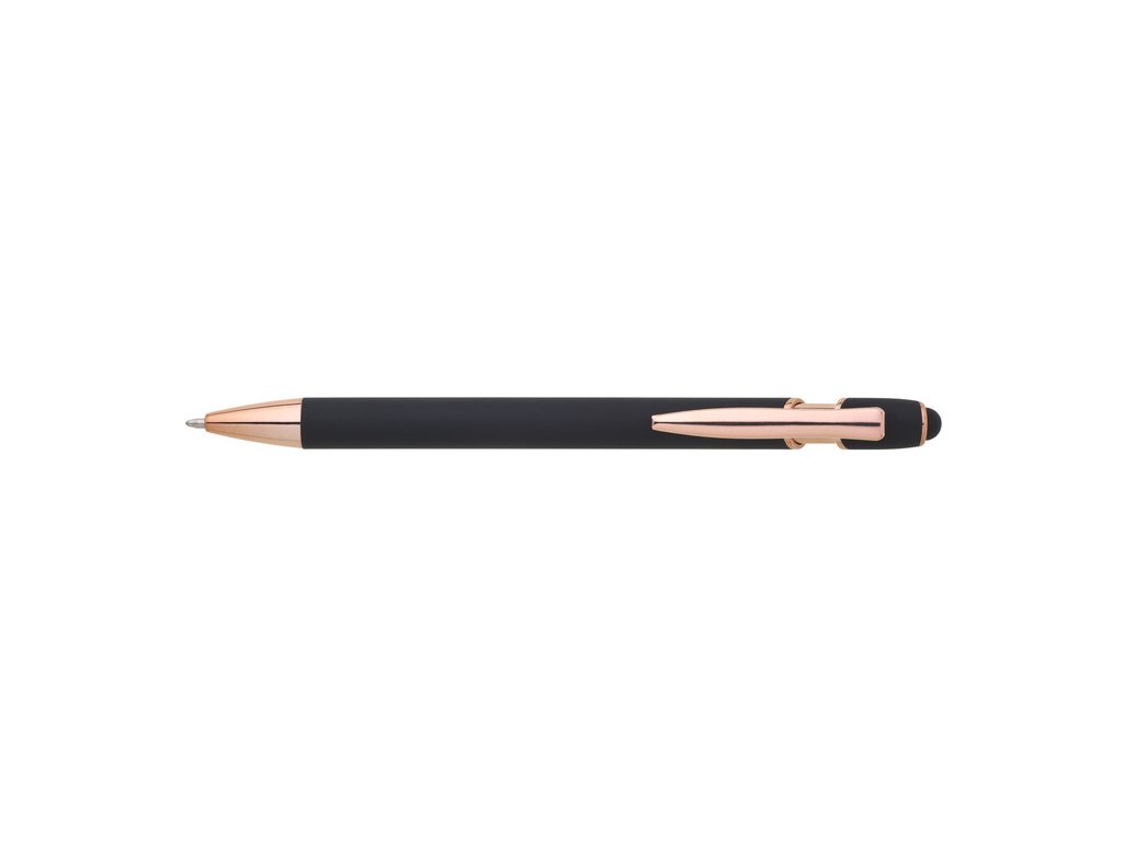 Kovová propiska se soft povrchem, touch koncovkou a doplňky v růžovo-zlaté barvě. Laserované logo je lesklé, růžovo-zlaté. Náplň modře píšící. Výsledný efekt laserového značení je lesklý, v barvě doplňků.